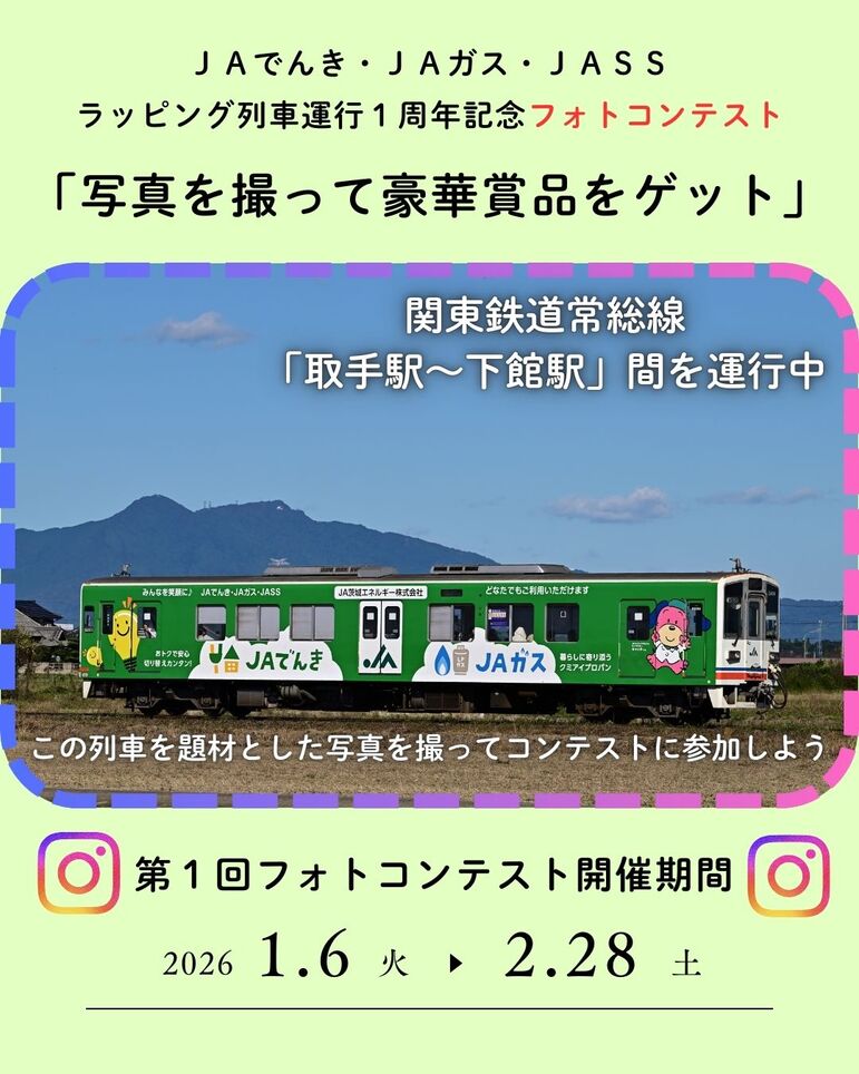 関東鉄道常総線(下館駅~取手駅間)を走る「JA茨城エネルギー株式会社のラッピング列車」を題材とした画像を、応募方法に従って送信してください。